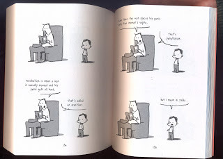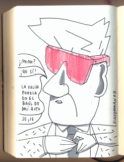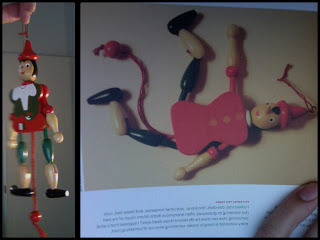 Recién fui hasta la mesa del comedor a buscar un libro que estaba buscando (Confesiones de San Agustín). Moviendo papeles y carpetas encontré el muñeco de Pinocho (foto, izquierda) que le trajeron a mi hijo de Italia. En ese instante paré de buscar y fui hasta la cocina a mostrarle cómo funciona (tirando de la cuerda para abajo). Lo entretuve un rato, cuidando que no lo rompiera y volví a mi lugar de trabajo. Dejé de buscar el libro de San Agustín. Antes de seguir con lo que tenía que hacer hoy, decidí leer algunas páginas más de mi libro nuevo "Aesthetics: a memoir" del autor de comics italiano Ivan Brunetti, que tenía al lado del monitor y que venía leyendo desde anoche. Luego de pasar un para de páginas me encontré con una foto del mismo muñeco, pintado de otra manera (foto, derecha). Hola.