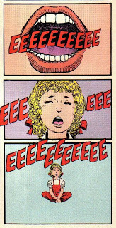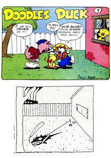 Como dirían los de Entrecomics, "parecidos razonables". No puedo evitar ver una similitud entre la primera viñeta del comic a color de Sheldon Mayer (1954) y la viñeta estática en blanco y negro, que siempre se repite, en el Angry Dog de David Lynch (1983-1992). Obviamente no estoy diciendo que sea un plagio. Pero lo primero que pensé cuando vi el comic de Mayer fue: "Es el jardín del Angry Dog". Cosas misteriosas que suceden detrás de las viñetas. Además al pasar del color al blanco y negro, y con la planta industrial apareciendo en el fondo, pareciera una visión post-apocalíptica, desde la aparente inocencia de los 50´s al cinismo de los 80´s. ¿El perro se comió a esos alegres animales de Mayer?
