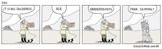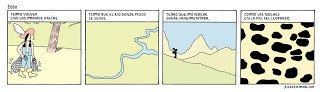 4. En el tapiz hay dos bandas, por encima y por debajo de la situación central. La banda superior pareciera ser meramente decorativa (aunque probablemente sean símbolos que no puedo interpretar). En la banda inferior se desarrolla una narración paralela, a veces en forma literal, como la que se desarrolla en el espacio del medio, representando los hechos concretos que hicieron a la conquista normanda, y a veces en forma simbólica, a través de metáforas. También se utiliza en forma ornamental. George Herriman hizo algo similar con "The family upstairs" y en espacio inferior se fue gestando "Krazy Kat". Tony Millonaire continuó con esa tradición en "Maakies". Y también Liniers en "Bonjour".