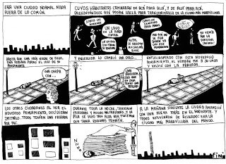 3. El texto que aparece arriba es la voz del narrador omnisciente, también una característica del comic moderno. Rudolph Töppfer, por ejemplo, a quien algunos consideran como el inventor del comic, ubicaría mucho tiempo después este tipo de narración en la parte inferior de la viñeta. En mi opinión es más eficiente ubicar el texto arriba.