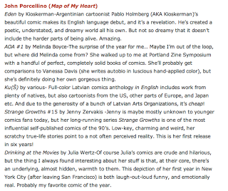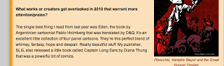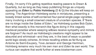 Edén es un libro terriblemente simple. Sus componentes son simples al punto del cliché ocasional, pero la forma en que Holmberg ordena los elementos es lo que hace vivir a cada página. Es un libro donde el todo es más que la suma de sus partes. Si una tira parece demasiado sentimental, la tira que sigue va a tener una vuelta más cínica o evasiva.