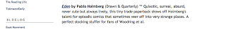 "Eden by Pablo Holmberg (Drawn & Quarterly) "" Quixotic, surreal, absurd, never cute but always lively, this tiny trade paperback shows off Holmberg's talent for episodic comics that sometimes veer off into very strange places. A perfect stocking stuffer for fans of Woodring et al."