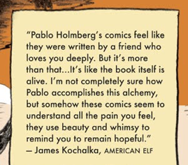 El comentario de Kochalka sobre Edén, en la contratapa de la edición en inglés.En 2009 Kochalka me escribió un mail de la nada, no nos conocíamos. Y me dijo que le gustaba mucho Edén. Me ofreció, sin pedir nada a cambio, presentarme en Top Shelf para que me publicaran en USA (Edén ya estaba con D+Q).Son esas cosas que no entiendo cómo suceden. Cómo uno de mis autores preferidos me escribe de la nada. Lo mismo exacto me sucedió con Porcellino.Nunca me imaginé que iba a sentir tanta nostalgia por el fin de una tira. Me pasó un poco cuando La Nación dejó de publicar Calvin and Hobbes, pero ahora es diferente. Esta tira me acompañó gran parte de mi vida y me transformó interiormente. En su momento me ayudó a ser optimista y a considerar el tema de tener hijos. Hoy a la mañana estuve releyendo el primer libro. Siento como si algo importante se va de mi vida. Como un cambio que me cuesta aceptar. Es uno de los comics que más veces volví a leer. Y me trae recuerdos de qué estaba haciendo en mis primeros veinte, noviazgo, facultad, etc. Parece otra vida ya. Lo increíble de la tira es que, si bien se refiere al pasado, mantiene vivo el presente de los sentimientos, el amor por la vida.