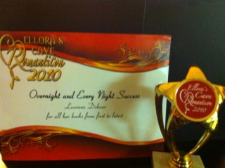 And last but not least... I won an award! It's kind of a funny story. I never expected to win one. They were calling them out and I was clapping, thrilled that so many people I admire and adore were getting them, having Mr. Laurann rush to go video V.J getting hers because her husband wasn't able to make it ( I'm sending you that video file probably tonight, V) and then they called out my name. Have you ever been so shocked your entire body goes limp? I almost slid right out of my chair and had to grab the table to keep me from doing exactly that. LOL. I even thought I may have heard wrong but then everyone at the table was grinning at me and waving me to stand up. I was so nervous one of the Cavemen held my hand. LOL! I took a picture of it and the trophy. Another funny story but I had taken 3 plastic contains in my suitcase and when I arrived at the hotel to unpack...2 of the bottoms of the containers were smashed apart so I carried my trophy home IN my purse, guarding it with my life against it ending up like those containers. It's safely on my desk now. Here's a picture of it. It was a fantastic trip, I had a blast with Mr. Laurann, but that was just the icing on the cake. Thank you to everyone at EC and to everyone who reads my books!!! I wrote and thanked my editors too! LOL. Mr Laurann was nice enough even to ask Caveman Angelo to sign a copy of Burning Up Flint for me since he's on the cover and he did! VERY COOL!