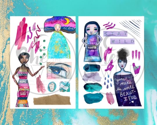 There are two packs available. One pack is dedicated to faces and figures, complemented by other decorative bits of ephemera. The other pack is all about colorfully created quotes and pretty painted background scraps.