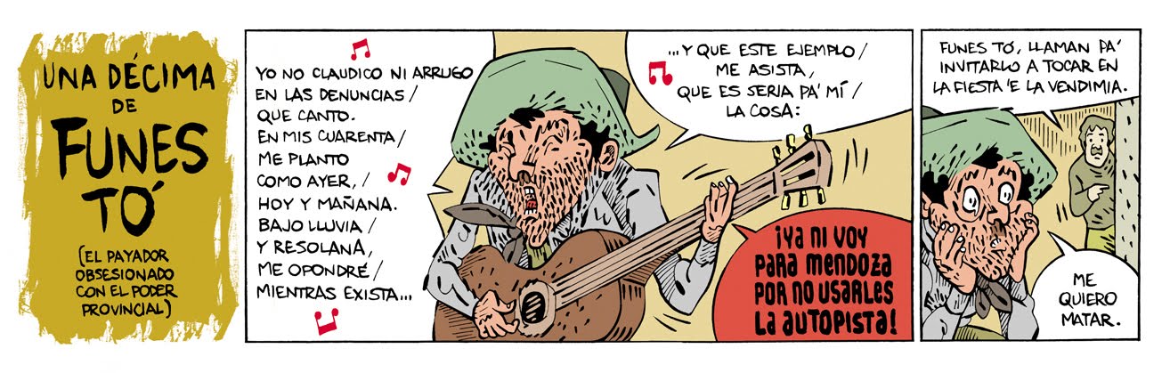 Hace algunos meses comenté esto. Luego sucedió lo siguiente: empezó a publicarse en San Luis un diario nuevo, y me convocaron para hacer algo en la contratapa. San Luis Diario es, por el momento, un periódico: aparece martes y viernes. He aquí las primeras cinco tiras. Supongo que la comprensión de las mismas resultará cristalina para cualquier lector, sea o no puntano, excepto la segunda. Haciendo click debajo de dicha imagen, accederán a un link que explica un poco la cuestión. Link