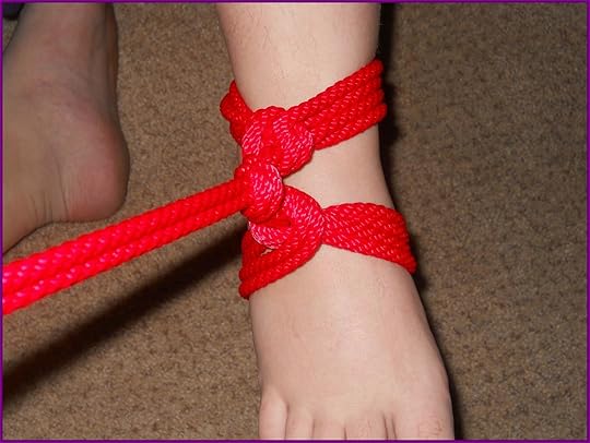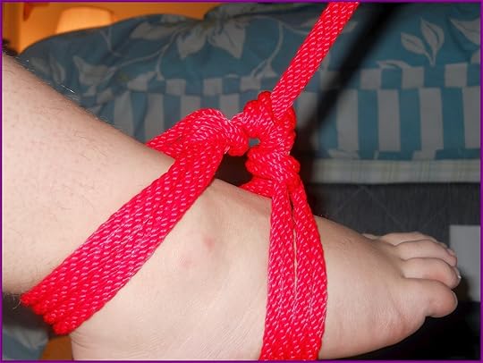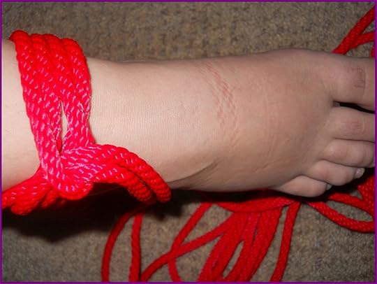 We played with rope! MDR and I have some lovely red rope that we like to use, and he decided to practice some things on my feet. Foot rope bondage can be really useful. Spread the legs, hoist them up, hold them in place...very versatile!