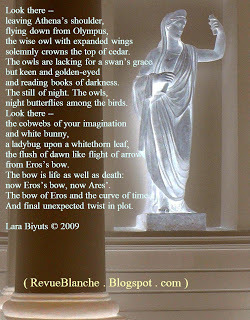 Born twice, first among the waves, then in the clouds; here not to work, not to toil in the hot sun, no, to be caught the toils of pleasures, at most. The family-tree is obscure, no metrics, only metricians. “Daughter of regiment”, the plebes would say, and esoterics would say, “Strange conjuncture of planets”. My name is a gift from Ephes. Apuleius would stung me by his “Golden Ass”, me, equal to Isis and Ishtar. Blood of Uranus rages in my veins; Kronos gave up when trying to reach me. Acknowledged as daughter by Zeus, who used to be Lord to humans, charites and nymphs--I’m among them, so young and taciturn. What’s in words to a tender passion? Young Paris surrenders, Helene surrenders. The sun-kissed isles are burning. Pathos is oozing, Lesbos has gone mad, Pasiphae and Mira are captured, and I am myself a mother of Eros the infant, with matrimonial fidelity dubious and at stake. Rejected again, for the fifth time, impassionate, ghastly, Poseidon is beating against the rocks and drowning the ships. Anchis, Ares, Adonis, Hephaestus, at cetera. The arrows of Eros have reached many hearts. To Gods, I was always temptation. To mortals, I brought ambrosia, nectar. To those who turned a deaf ear to tread of mine, to those who rejected my gifts--my punishment, oblivion. Young Hippolytus was wrong... Where I am, today? What’s in words to the oblivion? What about my dreams and desires? Maybe, I walk over some wilted meadows of seashore, maybe, along the water edge, listening to the waves, attracted by me and bringing Hellas to my feet. Lara Biyuts © 2013