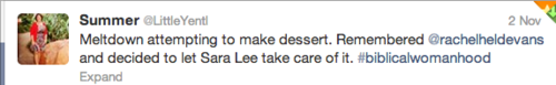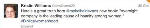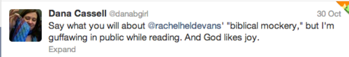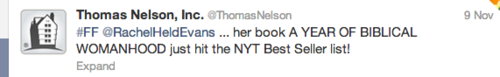 “I confess I'm not terribly familiar with Mary, but from what I know she seems like a rather sensible and smart woman. I did read her review of Year of Biblical Womanhood. I can see why she'd be frustrated that her vision of submission wasn't given space in the book, but ultimately her frustration is misplaced. If she's frustrated that submission is equated with brainlessly and meekly taking whatever the man dishes out, Rachel's the wrong one to complain about. Mary should be complaining about a certain vocal, respected, mainstream proponent of complementarianism (male, naturally) who says that submission does mean tolerating abuse. While the Pipers and Driscolls of the world frustrate me as an egalitarian, if I were a moderate complementarian I think they'd frustrate me even more. If complementarianism is being "misrepresented," it's by these men, not by Rachel. But we rarely hear pointed criticism of them (Driscoll excepted, but then it's mostly because he's so pervy, not because there's any fundamental disagreement on his views on submission). I get that there's always more affinity for those on your "side" even when you disagree, but really. If complementarians spent half as much time on getting their own house in order as they have hyperventilating about this book, they'd have a lot less "misrepresentation" to fear.”