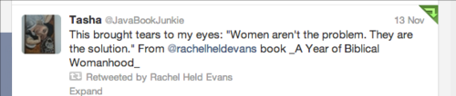 “With a word we can kill one another. With a few more words, we can resuscitate one another. The words in A Year of Biblical Womanhood are resuscitative.”