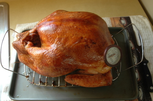 The Turkey Talk-Line was busy, probably because 6:00 a.m. on Thanksgiving morning is about the time most of us first-timers realize what we’ve gotten ourselves into. Fortunately, the menu included on option to listen to Betty or somebody talk about how to prepare a turkey, and I distinctly heard her say to remove the giblets and neck. So I pulled out the neck, ignored Martha’s instructions to reserve the offal for gravy, and threw it with the giblets into the garbage. (We Southern girls make our gravy out of grease, not body parts.) I prepared my basting liquid, seasoned the cavity, lathered the bird in butter, and placed it in the roasting pan.