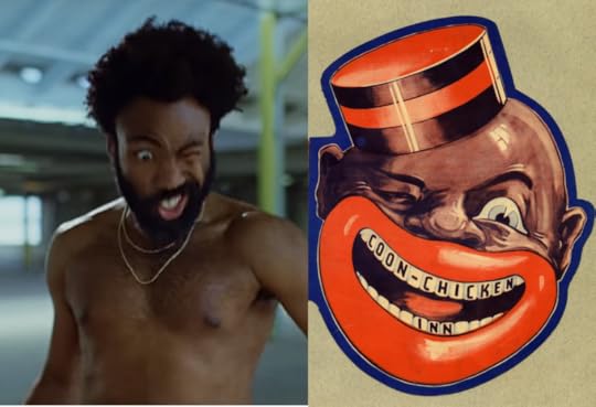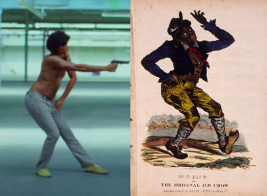 These two images, the minstrel posture and the grotesque facial expression, happen in just the first 50 seconds of this four-minute video. Put them alongside their references and you see there’s a lot to unpack. There are already millions of hits on videos and a handful of articles that are attempts to explain everything going on in this thing. They’re only scratching the surface –massacres, cell phones as weapons, apartheid, police violence, Jim Crow, mass incarceration. Like I said, I don’t have all the references, but I’m going to work on that.