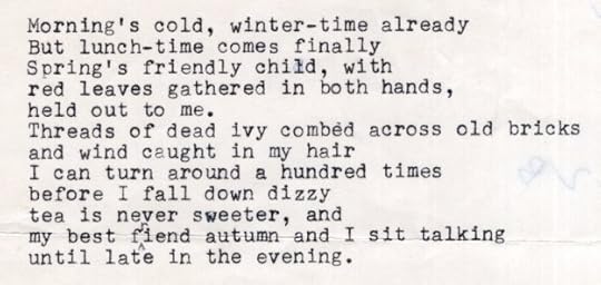 In 1980 I became friends with Brenda Sloan through a mutual friend, and we shared things we had written with each other. She gave or mailed me three poems she’d written. On the typed page is this note: “Written October 1974 – first time away from home. Not really poetry, just talking to myself.” I liked them, particularly the first one, above, and liked it enough to set it to music. Summer’s Gone