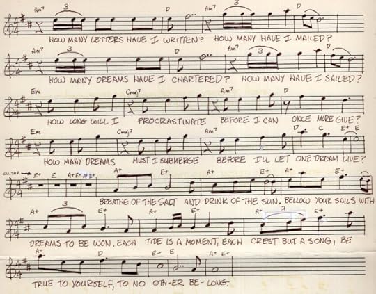 Some time in 1980 I began dating Kathy, who had a fine singing voice and played the piano. We sometimes sang together in my apartment with me on guitar (I didn’t have a piano), my songs or songs by others. At some point we created this song together, words by her, melody and arrangement by me. I have a typed copy of the lyrics from Kathy, and I made this song sheet for us to practice with, more elaborate that anything I usually did, but she could read music, so it made sense to put the notes in for her. I recorded it in my living room in September 1980, and I’m happy with the way it came out. Faith in Dreams