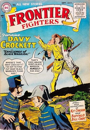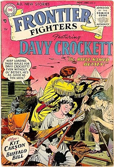 Ira Schnapp designed the logo, including the rough parchment or bark banner and powder horn. The original title was FRONTIER HEROES, as evidenced by this version of the logo I found in the DC files some years ago. The letter style is not particularly rustic or American, it’s closer to the Roman style Trajan, but that at least puts it in the long tradition of a style used ever since. Ira’s Davy Crockett character logo above is in a similar style but with rough notches, and he also did the rest of the cover lettering. Ira lettered all but three of the 16 covers in these two series, but only one interior story. Since I have room, I’ll show all the covers.