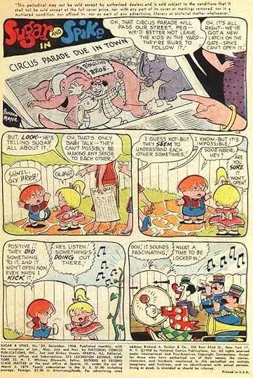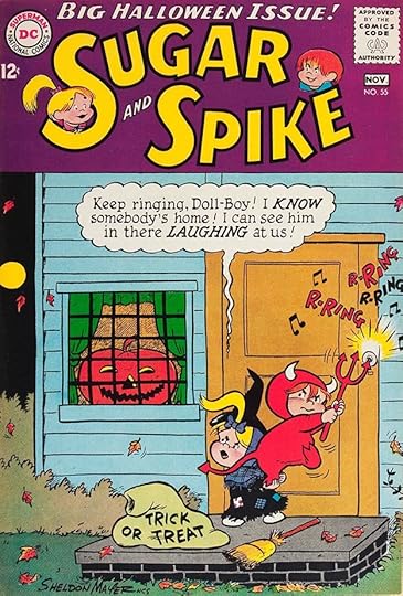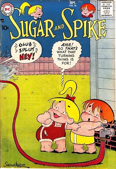 The longest-running series of those created by writer/artist Sheldon Mayer is this one, which began in 1956 and ran to issue #98 in 1971. Larry Nadle was probably the editor technically, but Mayer was a former editor at DC himself, and didn’t really need one I’d say, except to traffic the lettering and coloring. Mayer clearly had plenty of ideas for these two very young children and enjoyed writing and drawing them. Even after the series ended he continued to make more, and DC paid him to do so. Some appeared eventually in America, while others were only printed overseas. The two tykes are neighbors and friends, but Sugar was the leader and idea person, while Spike usually took the blame for her naughty ideas. They could speak to and understand each other, but to their parents, what they said came out as nonsense, while the kids couldn’t understand adults either. This led to many funny situations.