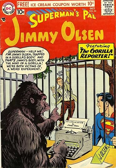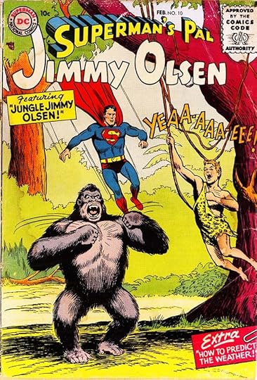 Issue #10 from 1956 is an example of DC’s love for apes, which were thought to sell comics . I like Jimmy’s jungle call, and also the paper-clipped caption box by Ira at bottom right.