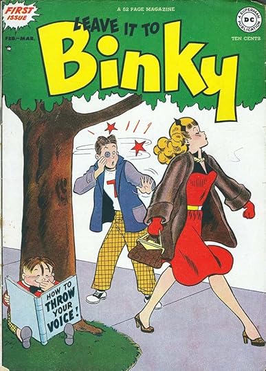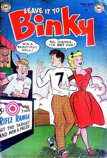 Having had moderate success with BUZZY and A DATE WITH JUDY, in 1948 DC started this new teen humor title. It was similar to those in content with teenager Binky, his family, and girlfriend Peggy taking the main roles. Little Allergy, seen on this cover also featured in some stories as a pest and spoiler. Similar characters sometimes had the lead. The book was edited by Larry Nadle, the regular DC humor editor at the time. I think the logo is by Ira Schnapp based on style. The title ran bimonthly or eight times a year until issue #58, Jan/Feb 1957, then there were two issues over the next year, probably to use up inventory. In 1968 the book was revived by editor Joe Orlando. It continued the same numbering. Issues 59-68 were largely reprints, though a few unseen stories emerged from inventory. After that, new stories were produced. The title became simply BINKY with issue #72, April/May 1970, and ran for another ten bimonthly issues. One final issue was published in 1977. Ira Schnapp had no work in the first eleven issues.