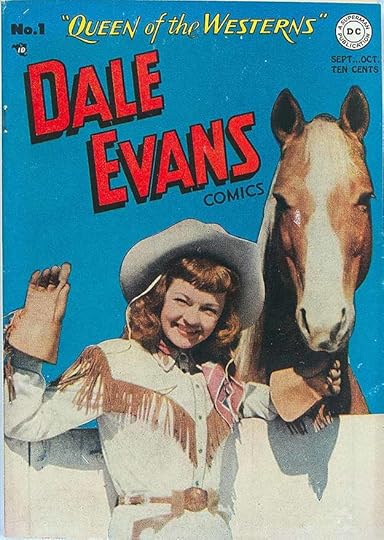 In 1948 DC published the first of many comics featuring Hollywood stars, DALE EVANS COMICS #1. It ran for 24 issues, ending with the July/Aug 1952 issue. Dale Evans had a complicated and eventful early life with four marriages, the first at age 14, the last in 1947 to cowboy star Roy Rogers that lasted until Rogers’ death in 1998. Dale broke into show business as a jazz singer in the 1930s and began making films in 1942 with a gradual emphasis on Westerns. She and Roy are probably best remembered for their popular TV Western show that ran from 1951-1957, for which Dale wrote the theme song “Happy Trails.” Many of the comic book covers are photos of her from her films. The top line lettering, “QUEEN OF THE WESTERNS,” is certainly by Ira Schnapp, and he probably also designed the logo. That top line appeared on many issues, and was often the only cover lettering until late in the run.