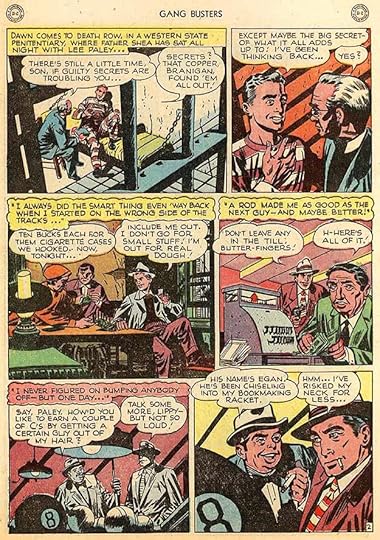 The genre of “true crime” magazines became popular in the 1930s, often focusing on headline-grabbing gangsters like Al Capone and John Dillinger. The first comic to follow the trend was CRIME DOES NOT PAY by Charles Biro and Bob Wood for Lev Gleason Publications, beginning with issue #22 dated July 1942. It proved popular, and reached sales of over 1 milllion copies a few years later. Biro and Wood’s comics were known for their gore and violence and tackled adult subject matter like sex and drug use. Other publishers followed with similar comics, as is usually the case, with perhaps the most shocking content appearing in the crime titles from EC Comics in the early 1950s. DC (National) Comics entered the genre with this title’s first issue dated Dec. 1947-Jan. 1948, but it was tamer and less violent than crime comics from other publishers, and it was based on a popular radio show that ran from 1936 to 1957 and also spun off into a successful movie and a TV show. The radio show was overseen by FBI chief J. Edgar Hoover, and could only depict closed cases, but of course it played up the violence when possible. DC’s version seems to have tried to follow the radio show plan at first, but I don’t know if any of the comics were close adaptations of the radio programs or not. Certainly as the comic went on it veered off into more fanciful directions. I’m not sure who designed the logo and did the cover lettering for the first issue, it might have been Ira Schnapp, or it might have been the unknown letterer whose work inspired Ira that I’ve nicknamed Proto-Schnapp. Proto-Schnapp did a lot of inside page lettering for the title early on. Ira did very little, his work was mostly on covers, starting later.