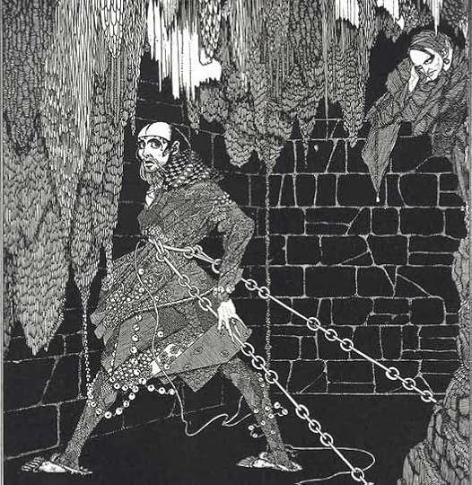 As she says in her notes, and as I recognized right away, Colleen’s style for this project was highly influenced by Irish artist Harry Clarke. I know his work mainly from his illustrations for “Tales of Mystery and Imagination” by Edgar Allan Poe. I’ve had the 1936 edition in my library for decades, example above, his art for the story “The Cask of Amontillado.” As we began to prepare for this, Colleen also shared some of his stained glass work, which I hadn’t seen before.