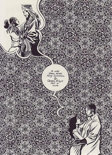 In addition to the exploration of the religion and culture of Islam, and the book includes stories from the Qur’an and The Bible, Thompson seems to have been equally inspired by western Orientalism, things like The Arabian Nights. Tales of that sort are here as well. Then there’s the Arabian mathematics embodied in magic squares and patterns that run through the work.