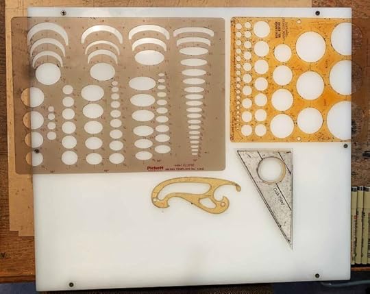 Here are the other drawing tools I’m using. Oval and circle templates, a small french curve, a small triangle, and a light box. I’ve had all these for decades. I used them when drawing logos by hand, and since then when drawing logo marker sketches for new logo assignments. The main differences between using pen and ink, as I did when drawing logos by hand, and using markers, is A) ink makes more precise lines and B) markers are easier to use, no struggling with ink flow and blobs. From normal reading distance, marker lines look fine, it’s only when you look very close that the uneven marker ink edges are visible. That’s not an issue with sketches, only with work that needs to be printed.