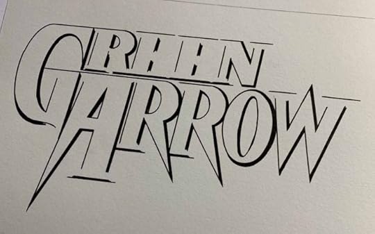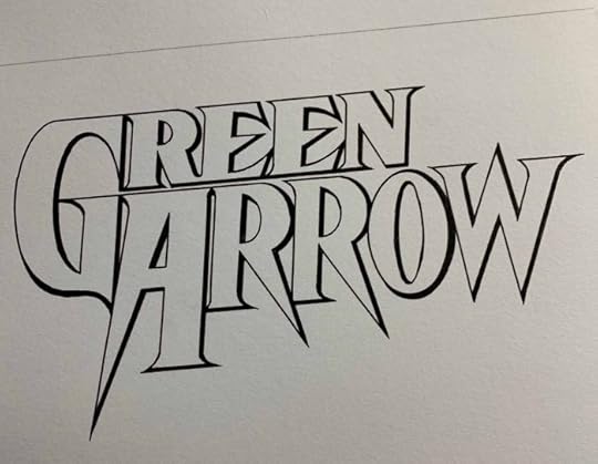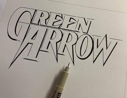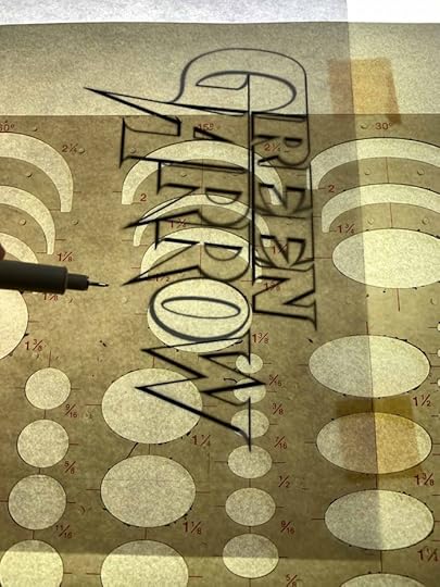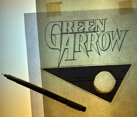 This is my own Green Arrow logo from 1993, drawn by hand. More about that process is here. A logo like this is made up primarily of precise straight lines, ovals, and curved serif points. Sometimes when doing these sketches I start with the ovals or curves, but this time I chose to begin with the straight lines, using a size 03 marker. You can’t see what I’ve done with the light box on…