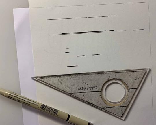…but with it off, the lines drawn are visible. Incidentally, the drafting tape on the triangle, which I applied and cut to size with an exacto knife, gives a slight lift to the edges so they aren’t touching the paper. This is not a big issue with markers, though it can be annoying if your marker leaves ink on the triangle that then gets on your fingers. The lifted edge is more important with pen and ink because if the edge you’re drawing with is touching the paper, the ink tends to flow under it, making a blobby mess.