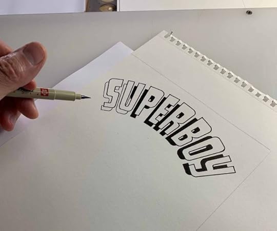 The french curve is used for very wide curves like the ones on this Ira Schnapp Superboy logo. Ira would have used a compass to set them up when he designed the logo. Since I only have to trace small segments of the larger arcs, the french curve works fine. On the Green Arrow logo, above, there was a narrow drop shadow that I filled in black as I went along. On this Superboy logo, I filled in the larger black areas with a larger marker, in this case a brush point Pigma.