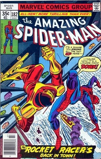 “Rocket Racers” and the line above it, both by Gaspar Saladino, from AMAZING SPIDER-MAN #182, July 1978. Note the upper and lower case THE, which Gaspar got from Ira Schnapp, and the thin outline on the open letters, plus the variable width of the caption border. Those parts are lost in the black fill of the caption box.
