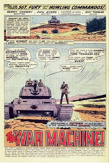 “The War Machine” is from the title page of SGT. FURY #118, March 1974. The story lettering credit is R.B. Ayers, meaning it was lettered by artist Dick Ayers himself, something I don’t recall seeing before, but then I wasn’t a regular reader of the book.
