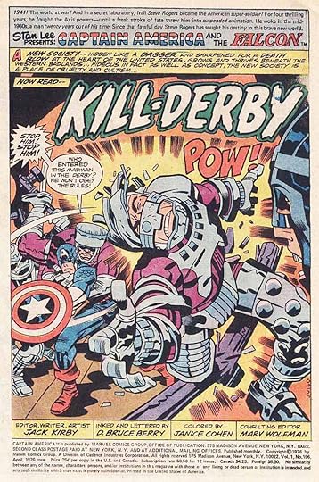 “Kill-Derby” by Costanza from CAPTAIN AMERICA #196, April 1976, page one splash. The lettering on the rest of the story is by D. Bruce Berry, but page one is clearly by John Costanza. His rounded cartoony open letters are distinctive, as is his lettering style.