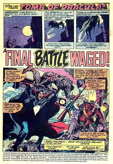 “A Final Battle Waged” by Costanza from TOMB OF DRACULA #42, March 1976, page one splash. this time Costanza lettered the entire story. BATTLE shows the influence of Gaspar Saladino to my eyes.