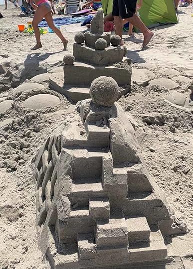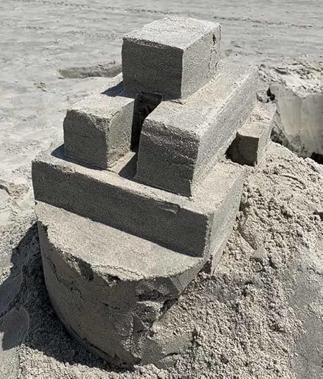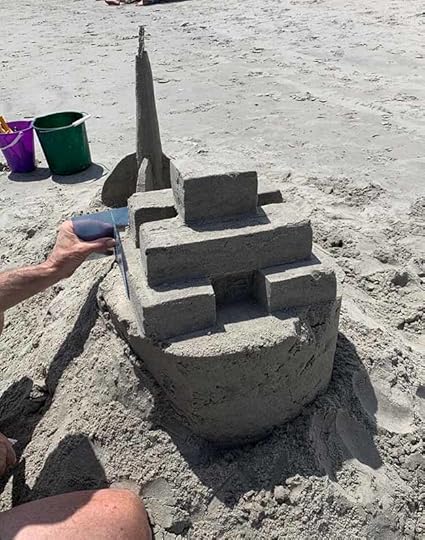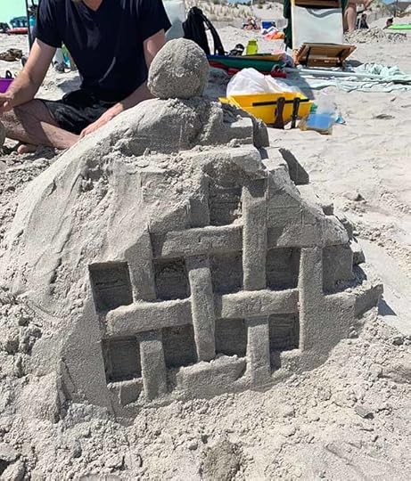 Tim was emulating the work of sand sculpture wizard Calvin Siebert on Saturday with this block structure. My tower, behind it, is nothing much, and was damaged by a wayward flying umbrella, so is hardly worth focusing on.