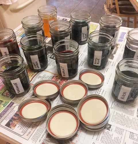 The first thing we did was to mix the twelve colors that came in dried powder form in packets. As instructed, I bought a set of 12 pint canning jars and put the colors in each one. To the powder we added 1.25 cups of boiling water and a small amount of distilled vinegar, EXCEPT for the orange, which gets no vinegar. Above, I kept the packet under that jar to remind me. I also labeled the jars to avoid confusion later.