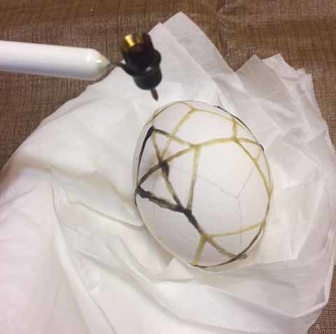 Next I began going over the pencil lines with the medium-size writing tool or kistka, filling the reservoir with beeswax, holding the writing tip in the edge of a candle flame until it was hot and the wax flowed out of the small hole evenly. I did better with the wax flow and line control this time, and I can see where it’s something that would improve with practice. Always testing the flow on a tissue first helped prevent big blobs, and we used thin strips of black wax this time rather than cut-up chunks of untinted wax. The latter does get a color from the candle soot, but having the color already in the wax made it easier to always see where you’d put the lines down. A small quarter-inch length of the wax strip was perfect to fill the reservoir and fits right in, much easier. When it’s the right temperature, the wax flows rather like a fountain pen or a technical drawing pen, but you need to keep warming it in the candle flame and testing the flow as you go. There are several rounds of this. All the lines drawn on the white egg will, of course, be white lines on the final design. You need to think in reverse, sort of like scratchboard art.