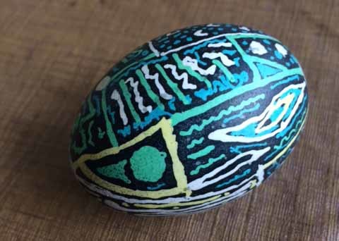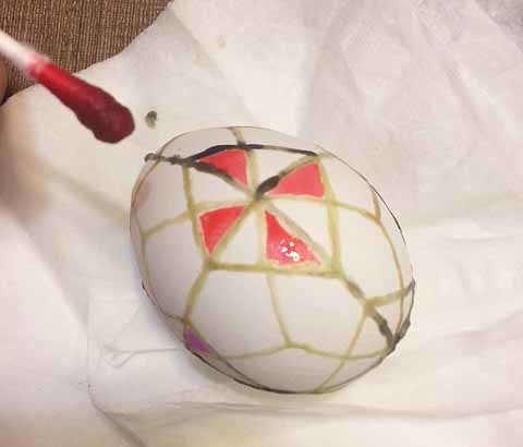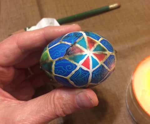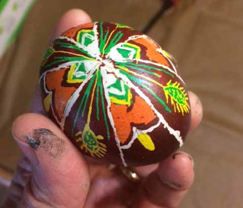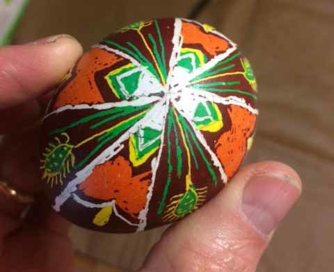 Ann’s egg uses a design she got from a YouTube video how-to. She had the video on her laptop and would do a layer, then run the video to show the next layer, until it was all done. It’s a Ukrainian design, but a looser and less geometric one, that I think turned out great