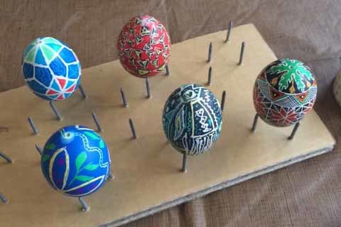 The empty shells were put on this drying rack Tim made. They have to dry completely inside and out before you do the final step, coating the shells with polyeurythane varnish. Ann’s egg had a mishap, so is not here, it was out in the garage getting some repair work. Below are all the finished eggs.