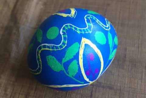 After coloring and covering some areas, I dipped the egg in the light blue dye. They call it light, but it’s more of a medium blue. The color went on well on these farm eggs I found at the supermarket. You want eggs that haven’t been scrubbed with chemicals, and you should handle them as little as possible, so you hold them with a tissue.