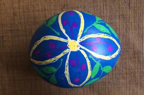 Ellen’s egg used the royal blue background color, very pretty. It’s a design she made up using ideas from the book or other psanky books Tim brought.