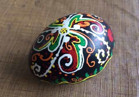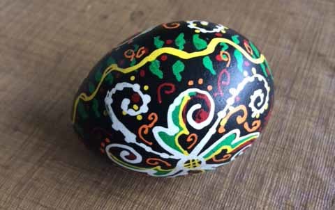 The next step is to remove all the wax by holding the egg very close to, but not right over, the candle flame to melt the wax. then you wipe it off with a tissue. This takes a long time, but is the most fun part as you get to see the final design gradually revealed. If you get the egg right over the flame, soot will form on the surface, not a good thing, but it does wipe off, though not easily. When you’ve melted off all the wax you can, there’s still a thin layer that is removed with mineral spirits.