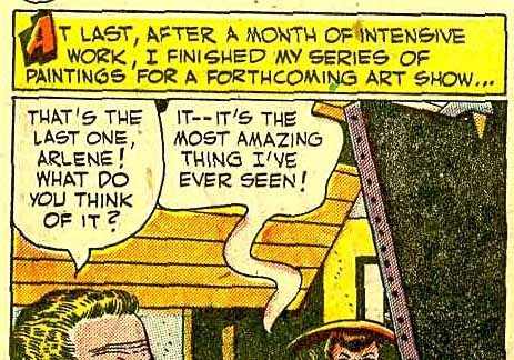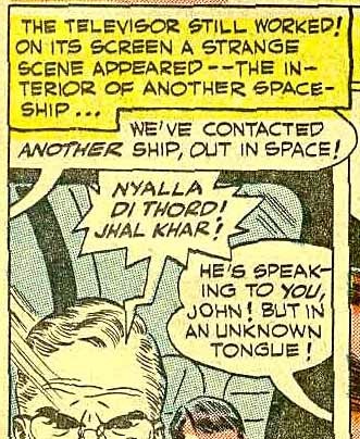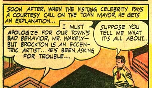 As it turned out, the revised first page didn’t include this sign Alex was writing to Gaspar about, but he clearly knew who would be lettering the story. So I decided I should look for style clues in the pages of “Artist of Other Worlds.” Writer/artist and comics historian Michael T. Gilbert was kind enough to send me scans of the entire story (he’d provided the one I already had of the first page), and lots of style clues emerged. But first, let me point out the story title above as lettered. Once again it doesn’t look at all like Gaspar’s work. Still quite puzzling, but at least consistent with the JIMMY WAKELY stories!