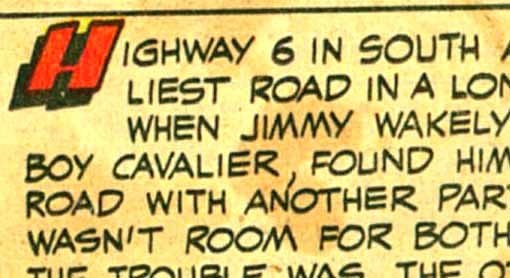 Here’s a detail from the second story page. While the scan is a little wonky, the similarities to the JIMMY WAKELY work are clear. Same initial cap style, same wide lettering with all the characteristic Saladino style points. Same wide balloon tails.