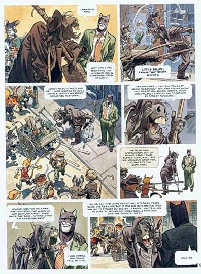 In case you’ve missed it, a brilliant series of European albums featuring Blacksad has now reached its fourth volume in this country, with the previous three being published together by Dark Horse, and this one on its own. Blacksad is a classic film noir detective series with a twist: all the characters act and look mostly human, but are also animal in form, most obviously the heads. These are not simply anthropomorphized animals as in, say “Pogo,” it’s a more complex mix. The characters act very human overall, but with little moments of their animal natures coming through here and there, just enough to keep things fresh.