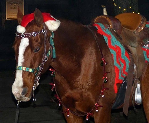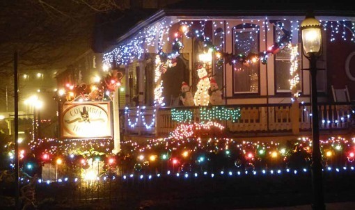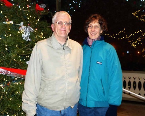 At least once in the Christmas season Ellen likes to get out for an evening’s entertainment with an appropriate holiday theme. Yesterday we drove down to Cape May, where the season is very much in evidence. Here we are in a shot taken by a friendly stranger in front of the town’s Christmas tree.
