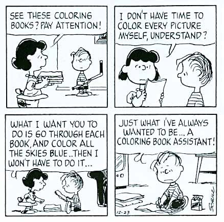 There’s a great example, one that really resonates for me. Lucy is so self-involved it’s fun to see. Another strip has her telling Charlie Brown that she missed school because she had a cold. “There must be something going around…lots of kids have been getting colds,” he says. “Mine was a lot worse though,” Lucy tells him, “because it happened to me.”