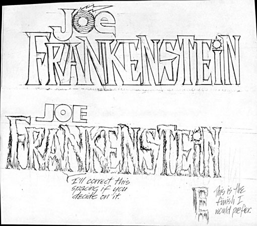 Here are those sketches. I liked them a lot, preferring the top one with its unusual letterforms and a hint of lightning in JOE, while the second one had that organic, rotted look of some of Gaspar’s famous horror logos for DC like SWAMP THING. Neither were quite what Chuck and Graham wanted though, and Graham asked for more sketches.