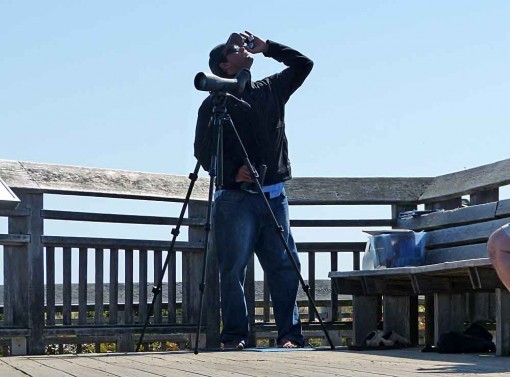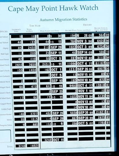 After doing my volunteer time at the Cape May Bird Observatory this morning, I went to the Hawk Watch platform at the state park, where the official hawk counter notes every raptor that passes by, a project partly funded by the New Jersey Audubon Society to help us understand what’s going on with bird populations. Most of the raptors that come this way are young birds born this spring, migrating for the first time. If the winds are right they’re pushed toward the coast, then follow it south, until the come the the pointed end of New Jersey. Then they usually stop to consider whether they want to fly across the Delaware Bay, or go up the bay side of the state to a closer crossing. It makes Cape May a natural migrant trap and an excellent place for fall birdwatching.