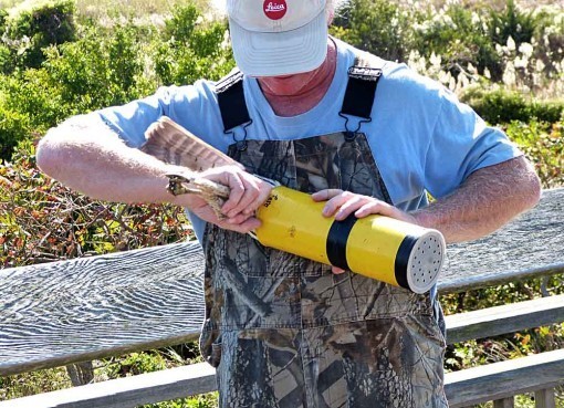 There’s another science project going on here with raptors: banding. For decades raptors have been trapped humanely at several locations around Cape May Point and banded by naturalists also hoping to learn more about the lives of migrating birds. You can read about the project HERE. While I was on the platform today, one of the banders appeared with a recently trapped hawk in one of the cans they use to keep the birds quiet while they affix the metal identification bands to their ankles. He announced it was a young Red-Shouldered Hawk, a species we don’t see very many of here, and everyone gathered around to see and photograph the bird as he took it out of the can.